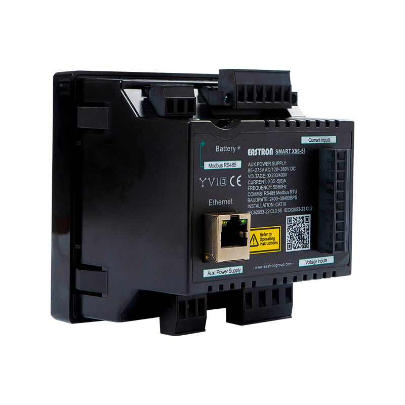 Smart X96-5I电能表支持5A CT输入,同时提供RS485 Modbus RTU和Etehrnet Modbus TCP通信,用于远程通讯和设置。 另外电表带4DI 和2DO 功能,可保存20条SOE记录且带有时间信息。