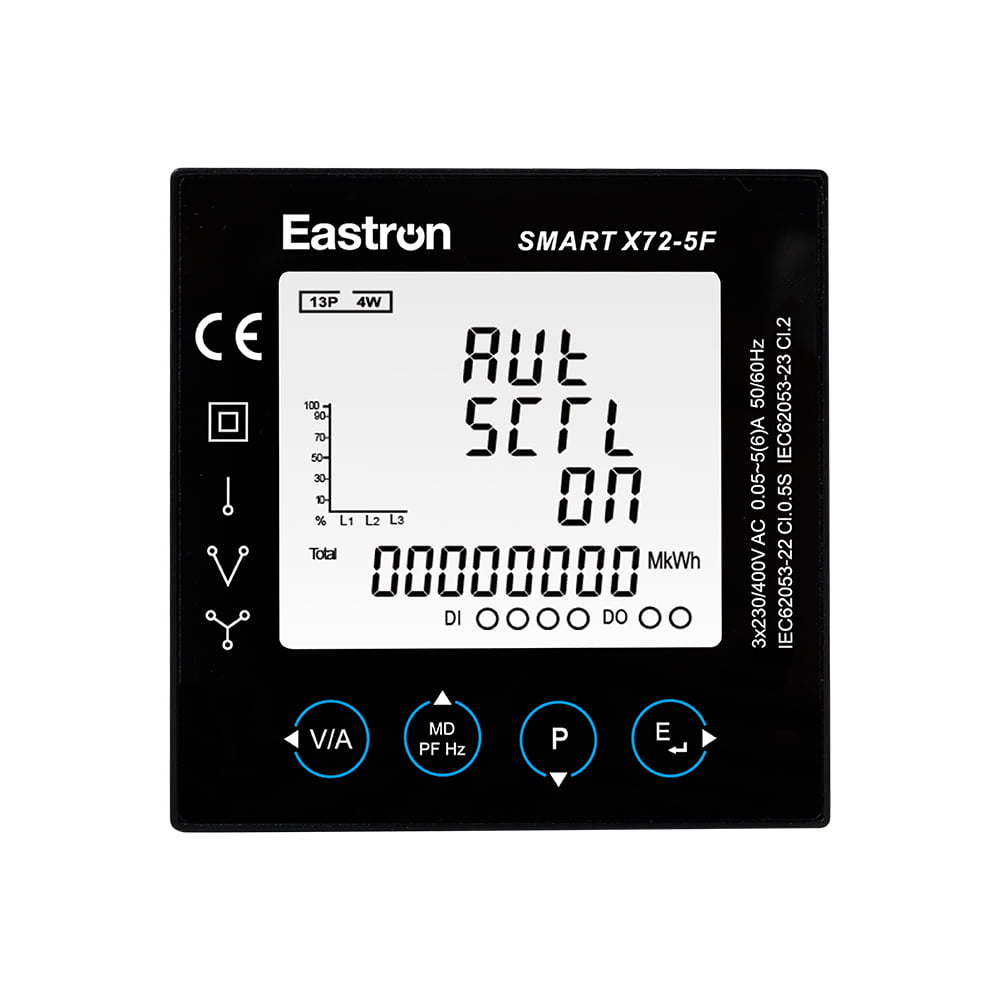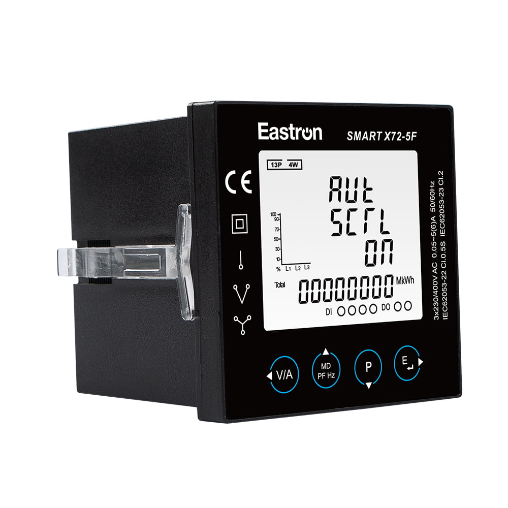 Eastron Smart X72-5F是一款RS485 Modbus 72x72面板式安装式多功能电力仪表。它可以准确测量和显示单相二线、三相三线和三相四线电网中的各种电力参数:电压、电流、功率、频率、有功功率、无功功率 、有功无功电量,正反向电量等。