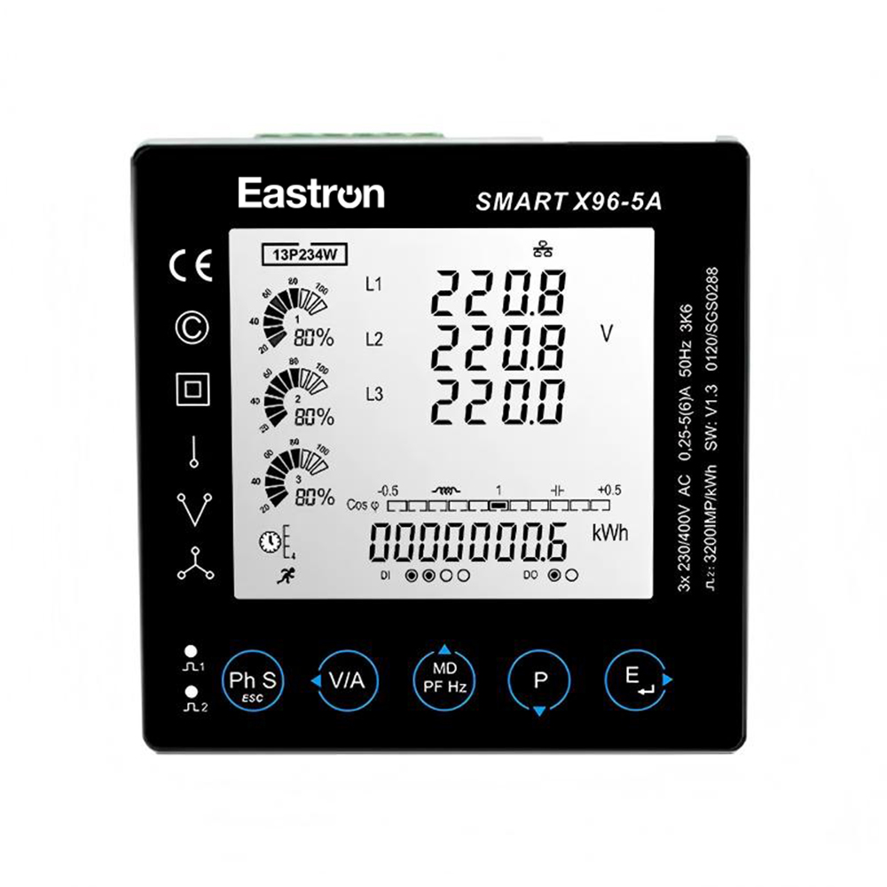 Eastron Smart X96-5A是一款RS485 Modbus面板式安装的多功能电力仪表。该表可测量并显示1p2w、3p4w和3p3w电网下,包括电压、电流、频率、功率、有功能和无功电量,正向和反向电量、谐波、需量等重要电力参数。