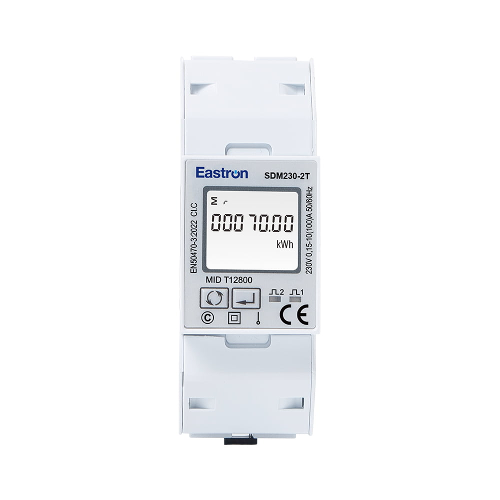 SDM230-2T是一款2费率双电源计量的导轨式单相多功能电能表。 可测量包括有功电能、无功电能、电流、电压、功率、功率因数、频率等重要电力参数。 这些设备支持最大负载100A的直接接入,提供2个脉冲输出和1个RS485通信端口,支持Modbus RTU 通讯,可进行远程监控和设置,适用于监测住宅、太阳能光伏、电动汽车充电系统、工业和公用事业应用中的能源消耗。